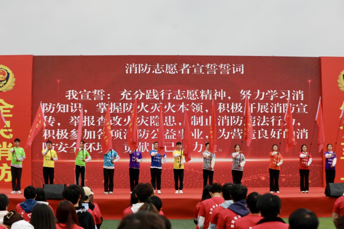 与会嘉宾为15支高校消防志愿者服务队授旗后,高校消防志愿者进行集体宣誓。