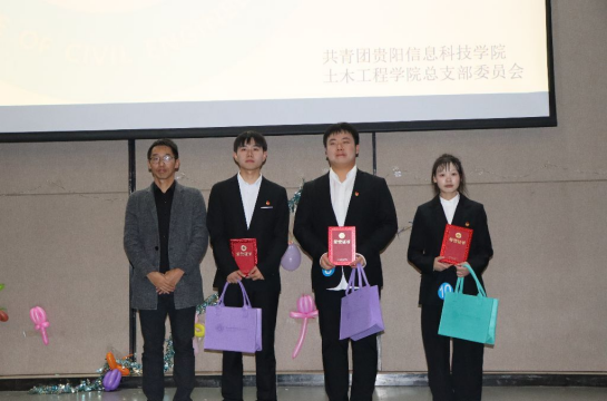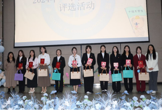 (图为校团委袁宇婷老师、学工处熊礼琴老师为2024年土木工程学院“十佳大学生”颁奖并合影留念)