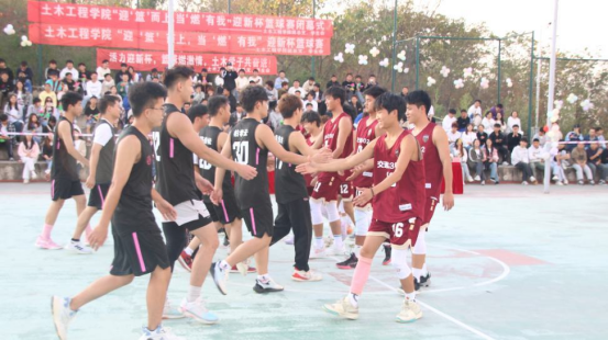 (图为土木工程学院迎新杯篮球赛决赛双方球员握手致意环节)