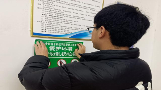 为提升同学们的环保意识与节约习惯,学院还在各教室内张贴上了“爱护环境”“节约用电”等温馨提示海报与标识牌;楼道内也增设了“禁止吸烟”标识,有力维护了公共环境的健康与安全。