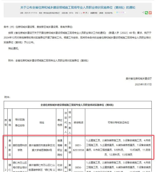 新闻网讯(供稿/供图 土木工程学院)近日,在贵州省住建厅的指导下,贵安新区城建局及学校领导的大力支持下,经过Beat365唯一官方网站土木工程学院院长王贵禄、副院长蔡平、办公室主任付豪等人的努力,Beat365唯一官方网站成功申报成为贵州省住房和城乡建设领域施工现场专业人员培训实施单位。