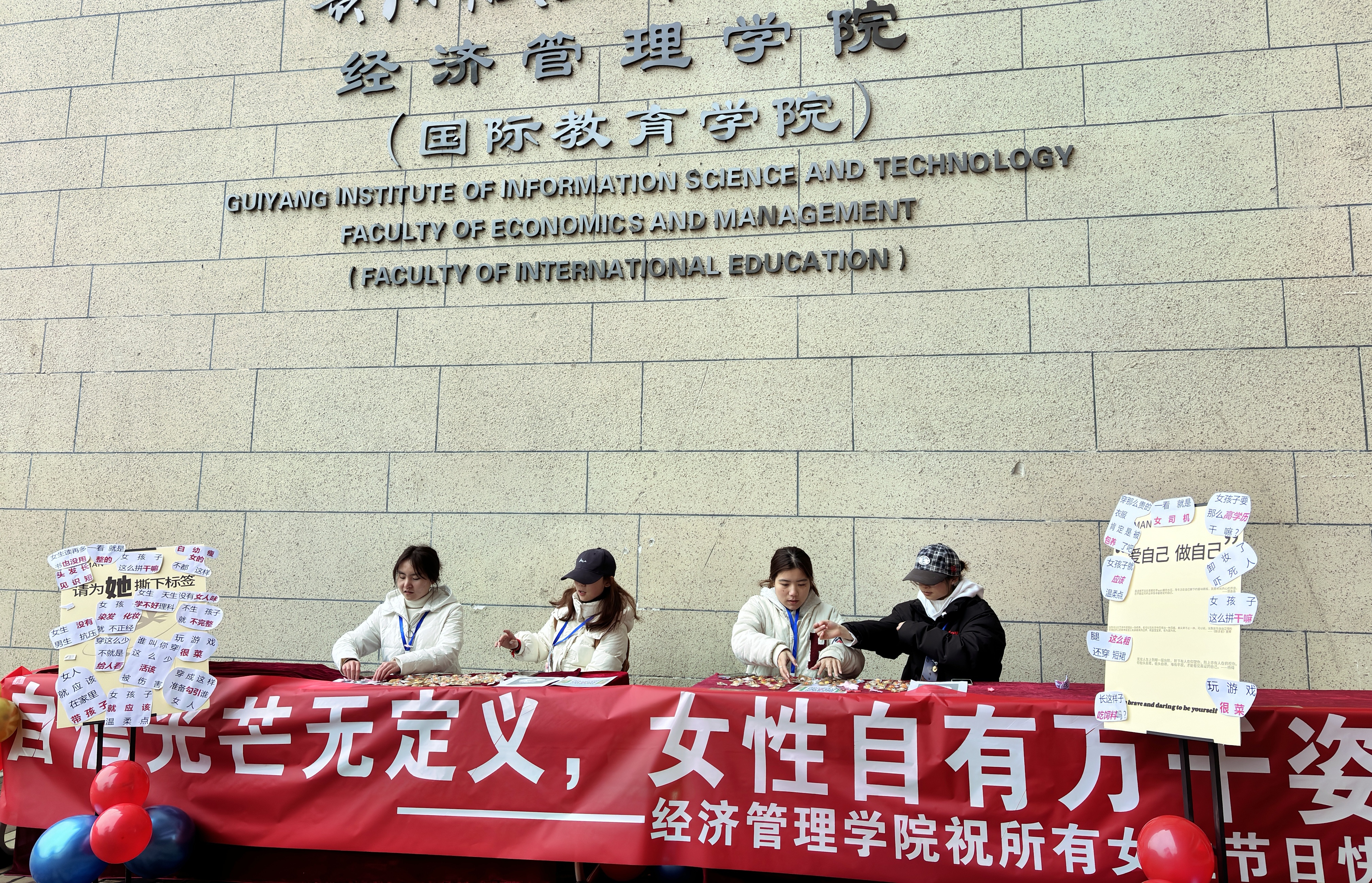活动主要设置了“撕掉标签,拥抱自我”与“不被定义,勇敢表达”两大环节。在“撕掉标签,拥抱自我”环节,经管学院的女生们步伐坚定,亲手撕下写有 “女生读再多书也没用”“学不好理科”“情绪化”“作” 等充满性别刻板印象的标签卡片,随后在留言板上郑重写下对新时代女性的全新定义,用实际行动彰显打破偏见、坚守本真的决心。