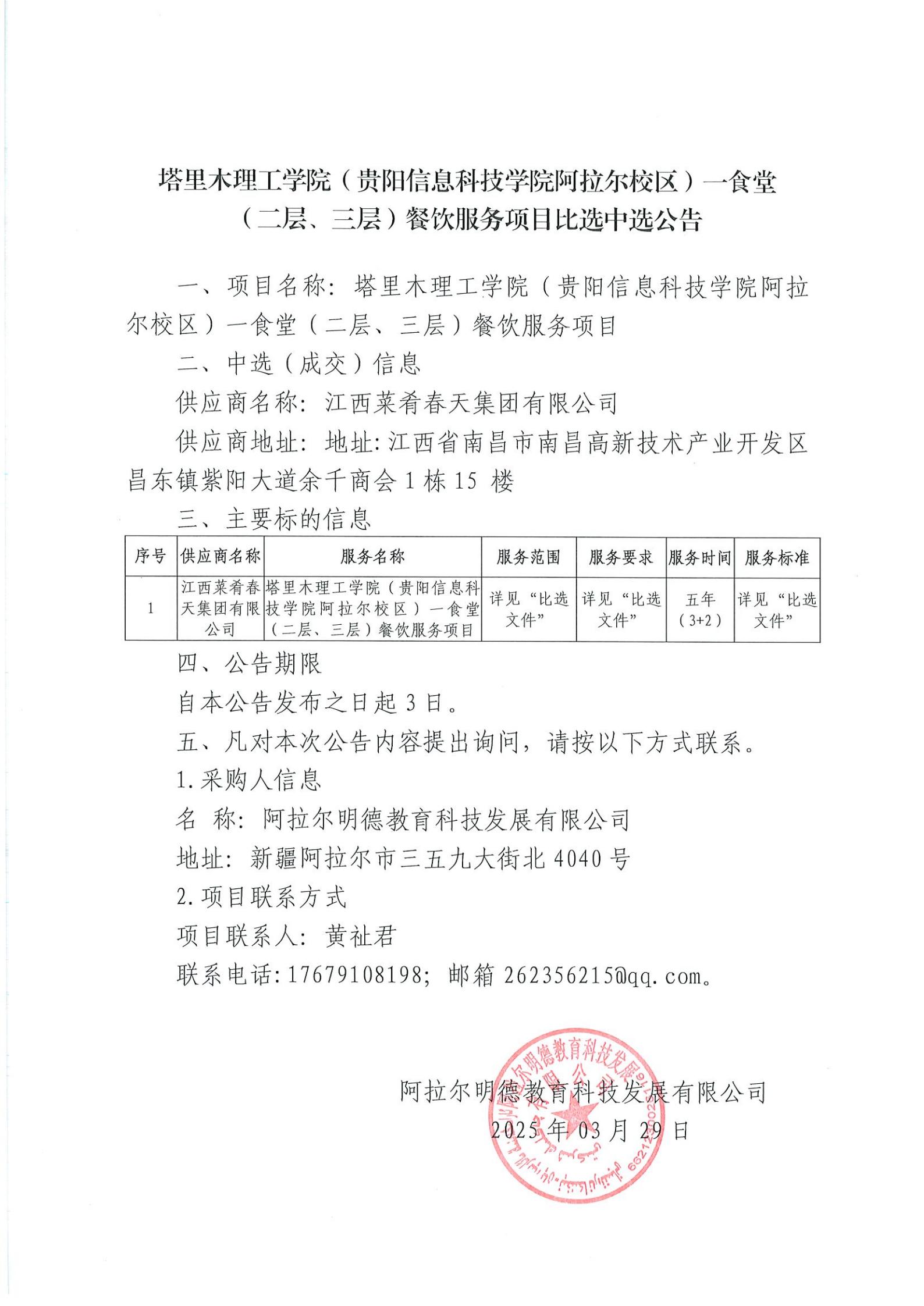 塔里木理工学院(Beat365唯一官方网站阿拉尔校区)一食堂(二层、三层)餐饮服务项目比选中选公告