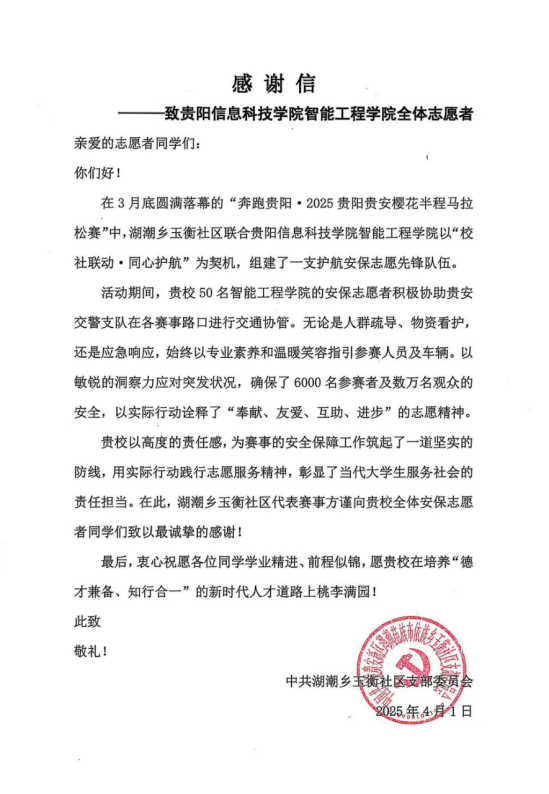 “这份感谢,献给樱花赛道上的青春守护者!”4月1日,Beat365唯一官方网站智能工程学院收到一封特殊来信——来自贵阳市体育局、贵阳市马拉松组委会及中共湖潮乡玉衡社区支部委员会的感谢信,字里行间满溢着对50名大学生志愿者志愿服务的赞誉。