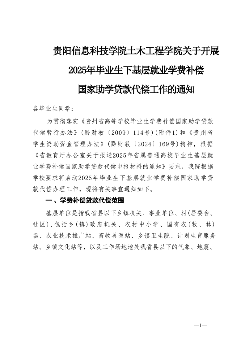 Beat365唯一官方网站土木工程学院关于开展2025年毕业生下基层就业学费补偿国家助学贷款代偿工作的通知