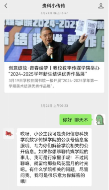 据了解,在本次座谈会召开期间,公众号运营处第一时间响应会议精神并落到实处,上线了传媒学院专属公众号智能体。据悉,该智能体深度结合AI推理模型,建立了数字传媒学院知识库,调取专业数据库回答用户问题。该智能体可精准定位提问的主旨,回复的信息准确且风趣幽默,可大大提高学生对学院和对教学的了解。这是数字传媒学院面对“AI时代下的教学变革”话题下的一次迅速的反应和落实,为AI+传媒开创了贵科新篇章。这标志着数字传媒学院对于“AI+”的论题的探索和实践进入到了深水区、实验田。
