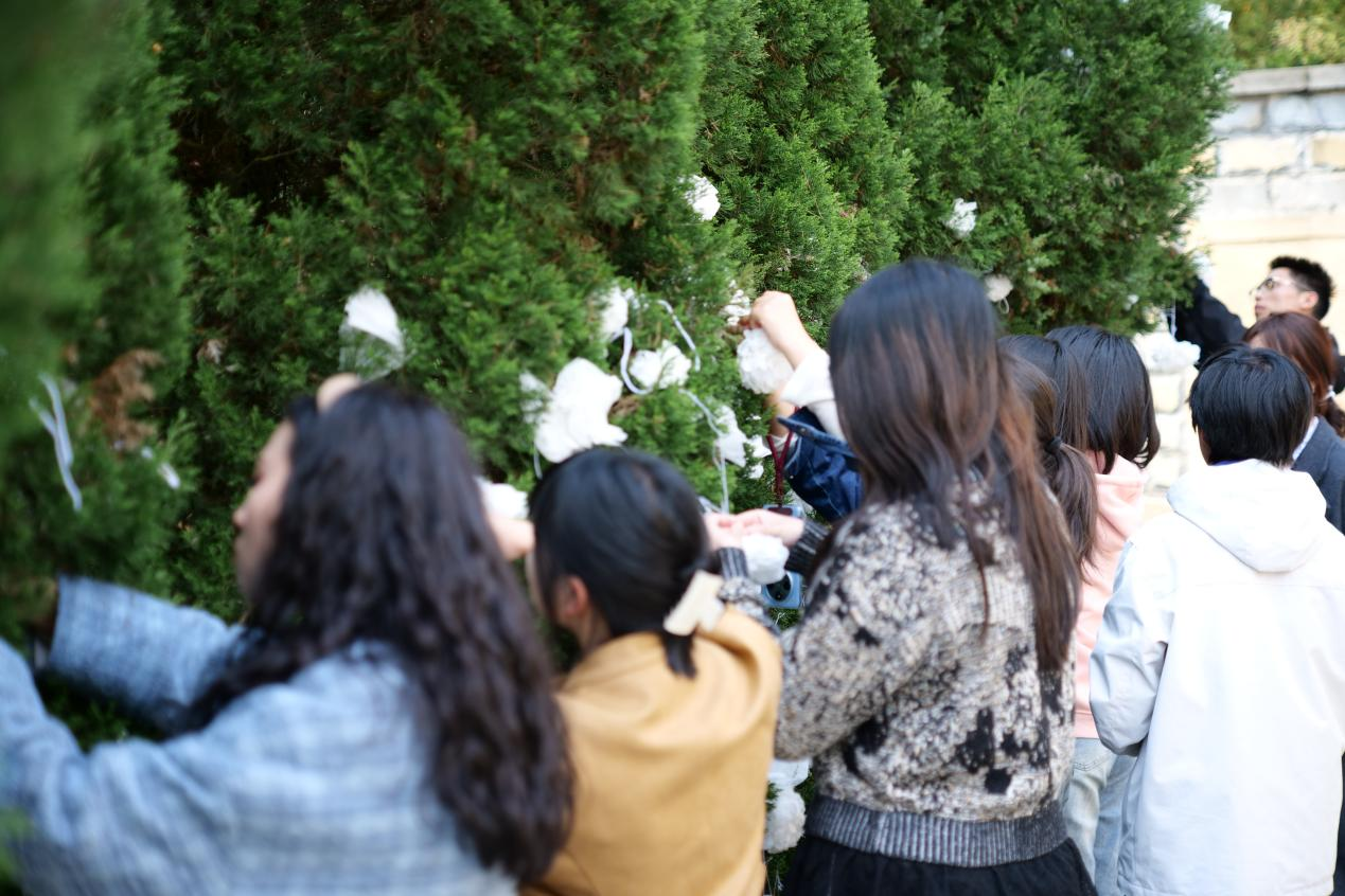 松柏寄情承遗志。师生们手持象征纯洁哀思的白花,轻轻悬挂于苍翠松柏之间,以传统方式表达深切追念,在巍峨的烈士纪念碑前,全体党员庄严举起右拳,重温入党誓词,铿锵誓言彰显了传承红色基因、勇担时代使命的坚定信念。