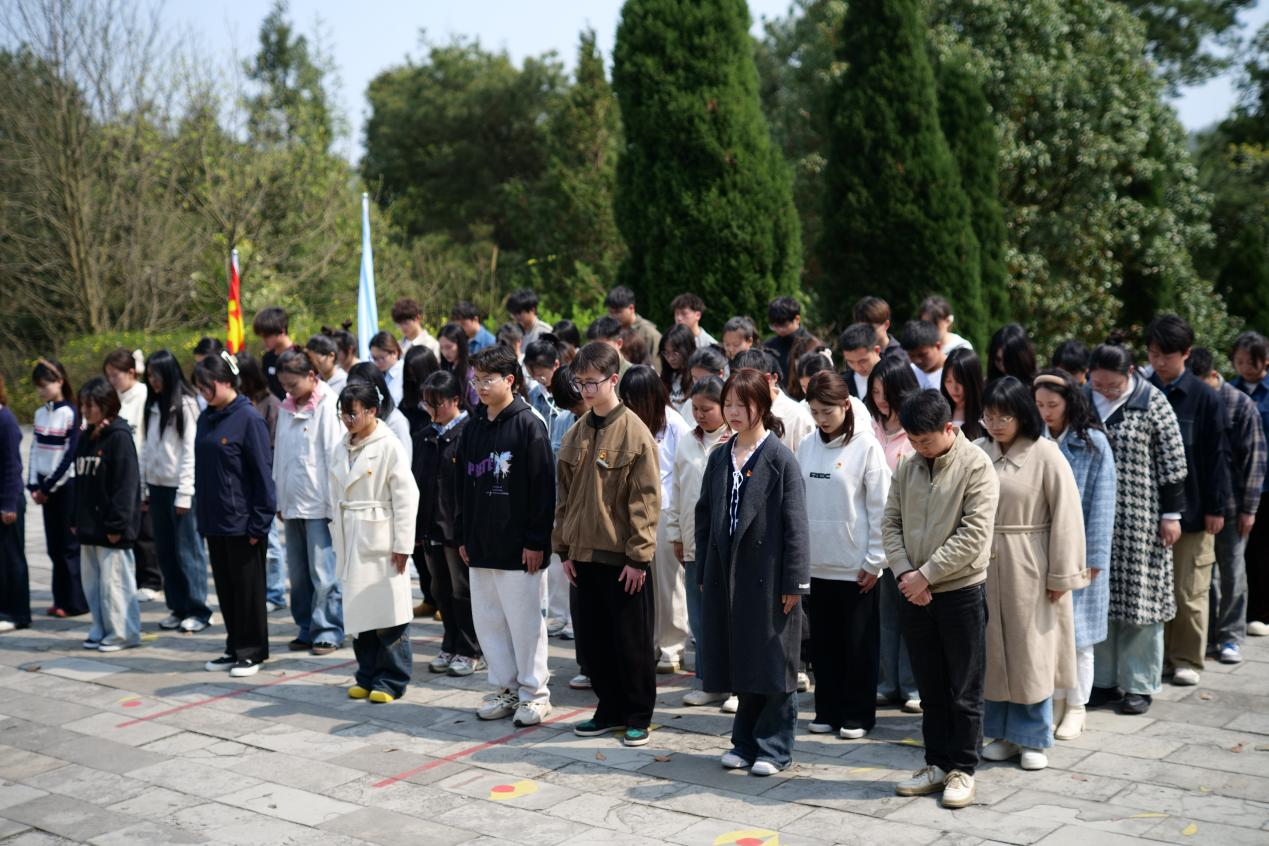 庄严仪式寄哀思。活动伊始,主持人详细介绍了祭扫流程。随后,祭奠仪式在雄壮激昂的国歌声中正式拉开帷幕。全体师生神情肃穆,齐声高唱国歌,激昂的旋律在陵园上空久久回荡,点燃了大家心中的爱国热情。国歌奏毕,全体人员垂首肃立,静默一分钟,以无声的哀思向英魂致以最崇高的敬意。紧接着,各学院学生代表迈着庄重的步伐,缓缓走向烈士纪念碑,将精心准备的花篮整齐摆放于碑前。