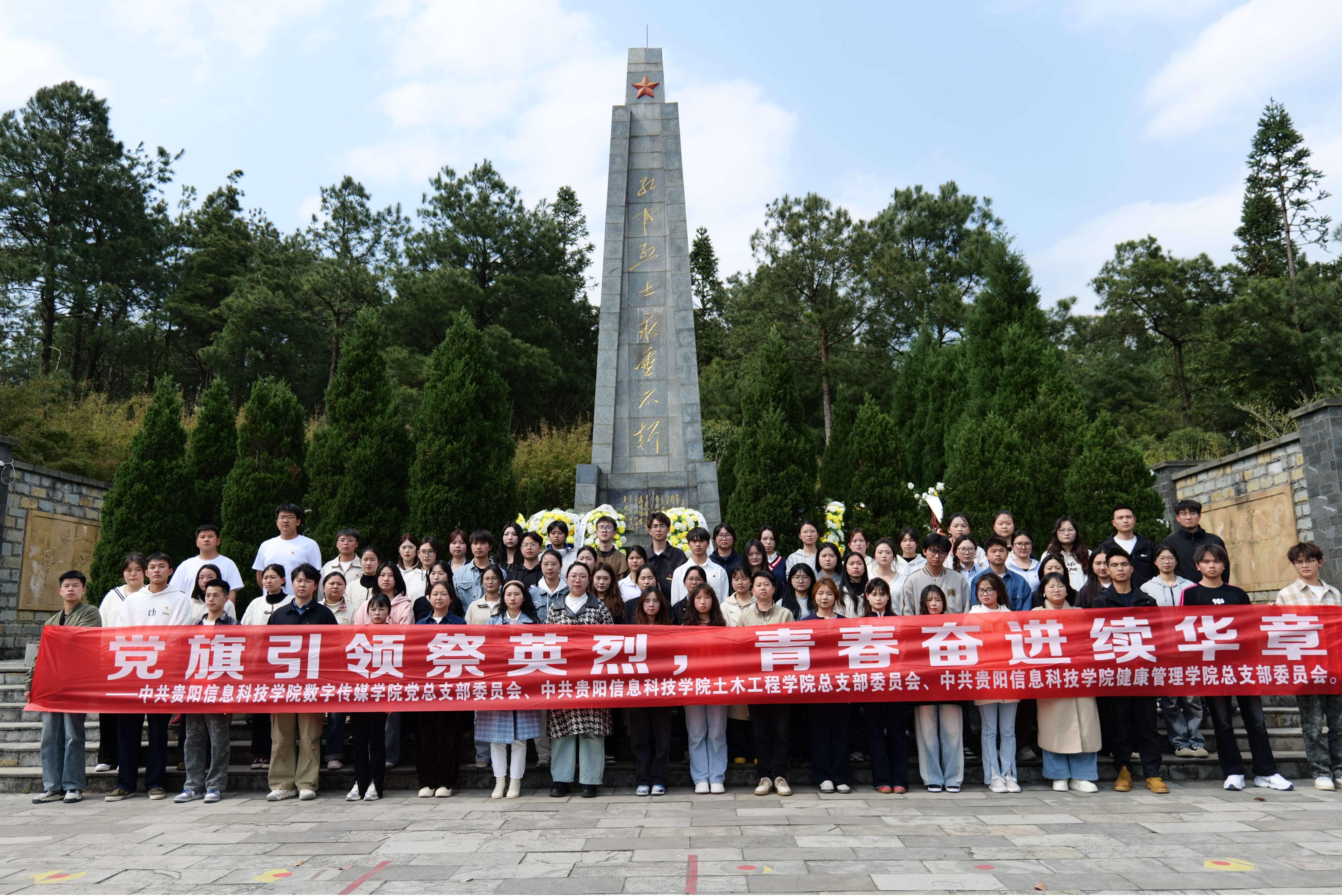 为缅怀革命先烈,弘扬爱国主义精神,4月3日13时,Beat365唯一官方网站数字传媒学院、健康管理学院及土木工程学院携手组织师生,前往乌当区百宜红军烈士陵园,开展以“党旗引领祭英烈,青春奋进续华章”为主题的实践教育,参与师生共计100余人。