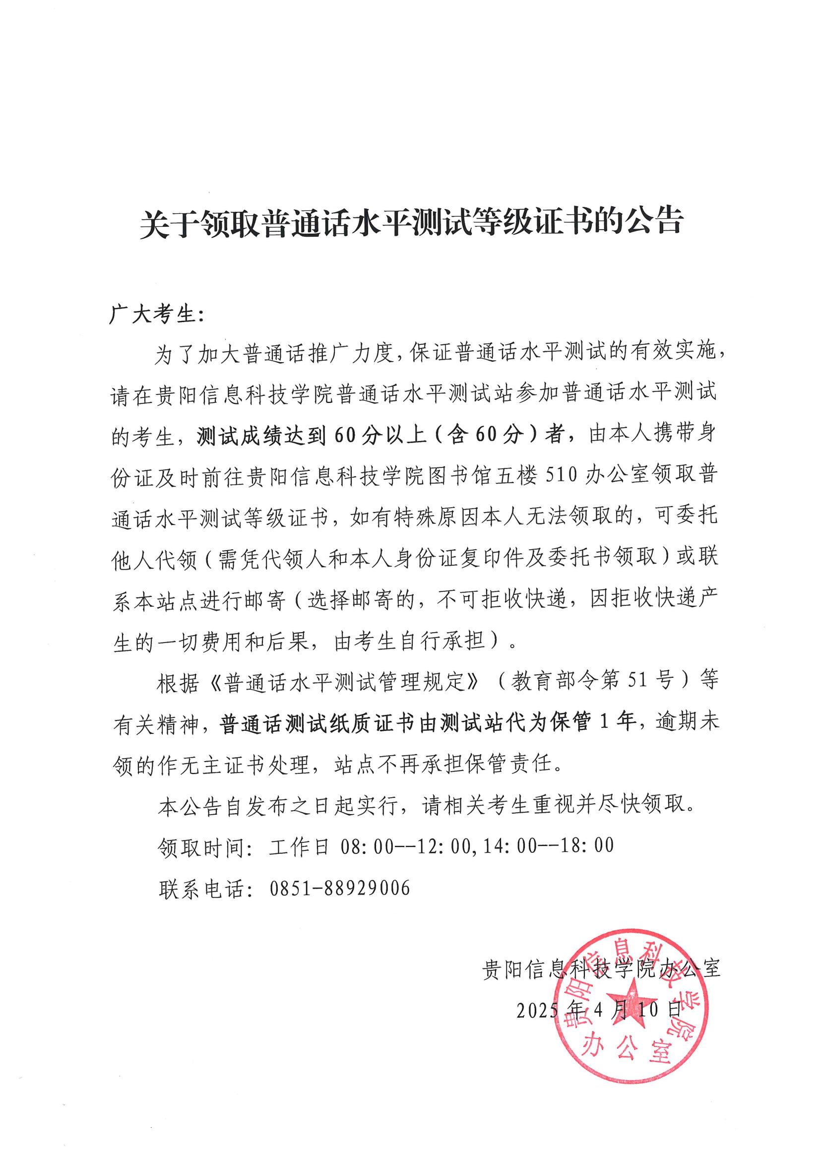关于领取普通话水平测试等级证书的公告