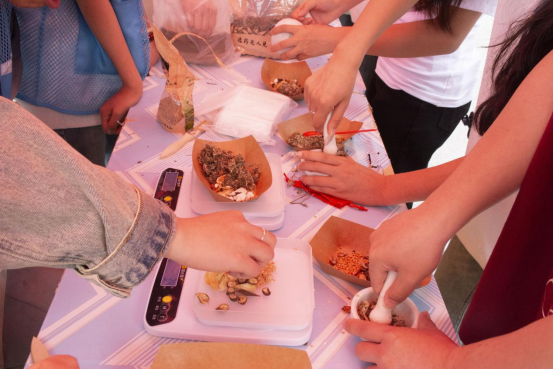 活动现场划分为“手作体验区”和“快乐领取区”,同学们既能亲手制作专属香囊,又能体验“抢鲜”领取的乐趣。驱蚊防虫、安神助眠、美容养颜、健脾和胃四款香囊各具功效,成为校园“养生新宠”。