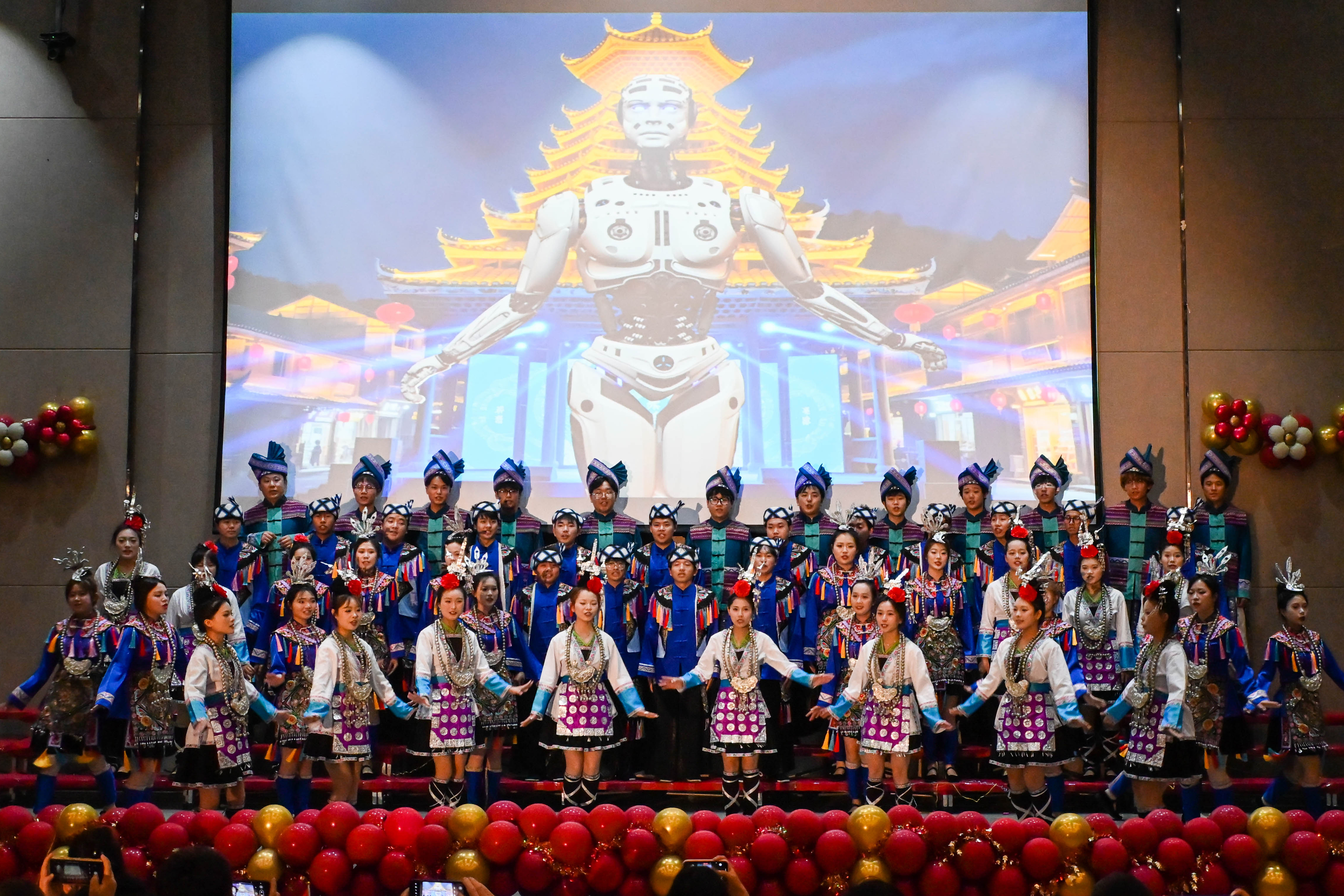 信息工程学院带来气势磅礴的《中国军魂》,铿锵有力的旋律仿佛重现了革命先辈的铁血荣光;经济管理学院深情演绎《我爱你中国》,用细腻的情感倾诉着对祖国母亲的眷恋;健康管理学院将《唱支山歌给党听》与《没有共产党就没有新中国》巧妙串烧,以深情颂党恩、以激昂赞辉煌;土木工程学院的《当》活力四射,唱出青春的热血与梦想;数字传媒学院的《侗歌声声唱给党》独具民族特色,用天籁之音奏响爱党乐章;智能工程学院的《玉盘》以灵动旋律,展现贵科学子良好的精神风貌和对美好生活的向往与追求。