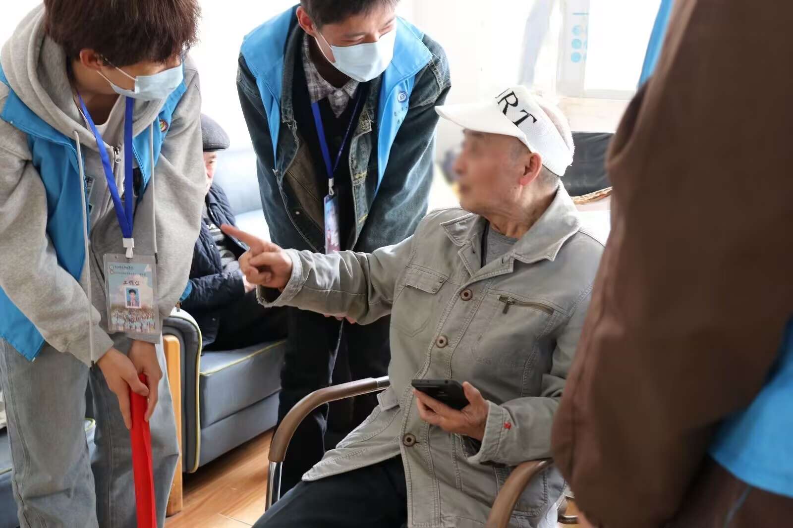 几位青年志愿者在老人面前,或坐或站,身体微倾,专注而敬重。他们边听边点头,眼神与老人交流,似乎在珍视这些回忆。整个场景充满温暖与宁静。
