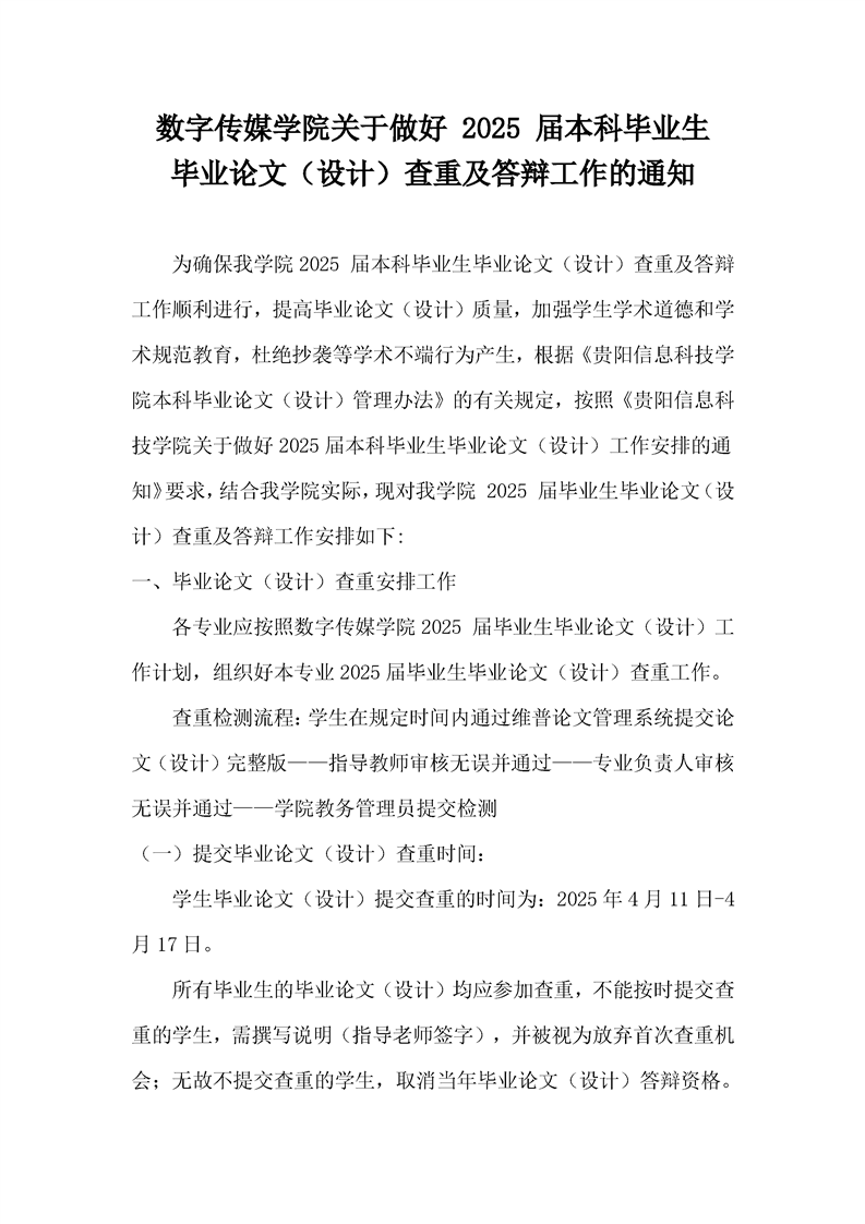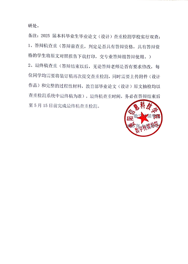 数字传媒学院关于做好 2025届本科毕业生 毕业论文(设计)查重及答辩工作的通知