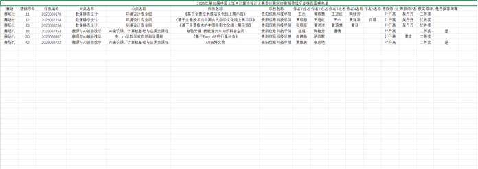在微课与 AI 辅助教学赛道,《AR 贵博文物》以增强现实技术重现贵州博物馆珍贵文物的魅力,《电驰云境新能源汽车知识科普空间》借助前沿技术普及新能源汽车知识,《基于 Easy AR 的行星科普》则带领观众探索浩瀚宇宙,这三个项目凭借出色的表现均斩获省二等奖;在数媒静态设计赛道,《基于全景技术的廉洁文化线上展馆》以新颖的展示形式荣获省三等奖;《基于全景技术的中国古代数学文化线上展示馆》《基于全景技术的中国电影文化线上展示馆》《基于全景技术的线上京剧展示馆》三个项目也凭借独特创意与精心设计,荣获省优秀奖。
