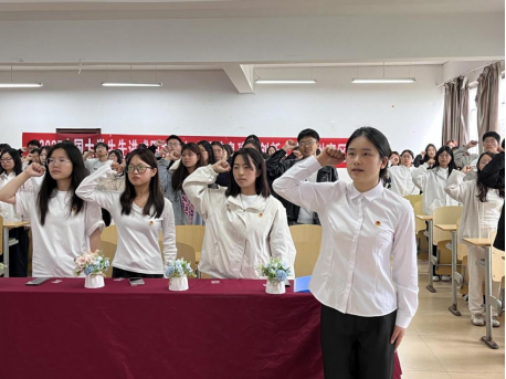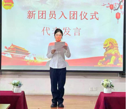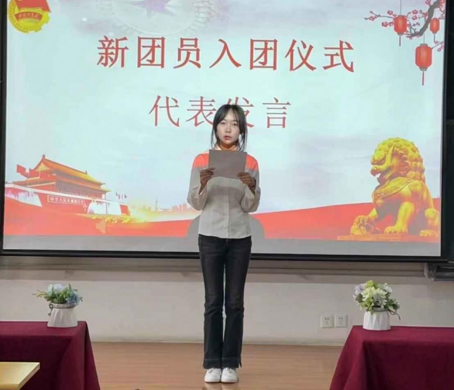 仪式上,新团员代表董苏成登台发言,她眼中闪烁着激动与自豪的光芒。她表示,当团徽别在胸前,庄严宣誓的那一刻,深切感受到了共青团员这一身份的光荣与神圣。“从今天起,我们不仅是父母眼中的孩子,更是肩负使命的共青团员。”她坚定地说,“我们将以团员的标准严格要求自己,在学习中勤奋刻苦,在生活中团结同学,积极参与社会实践,主动承担社会责任。以实际行动践行入团誓言,让青春在为祖国,为人民的奉献中焕发出更加绚丽的光彩!”