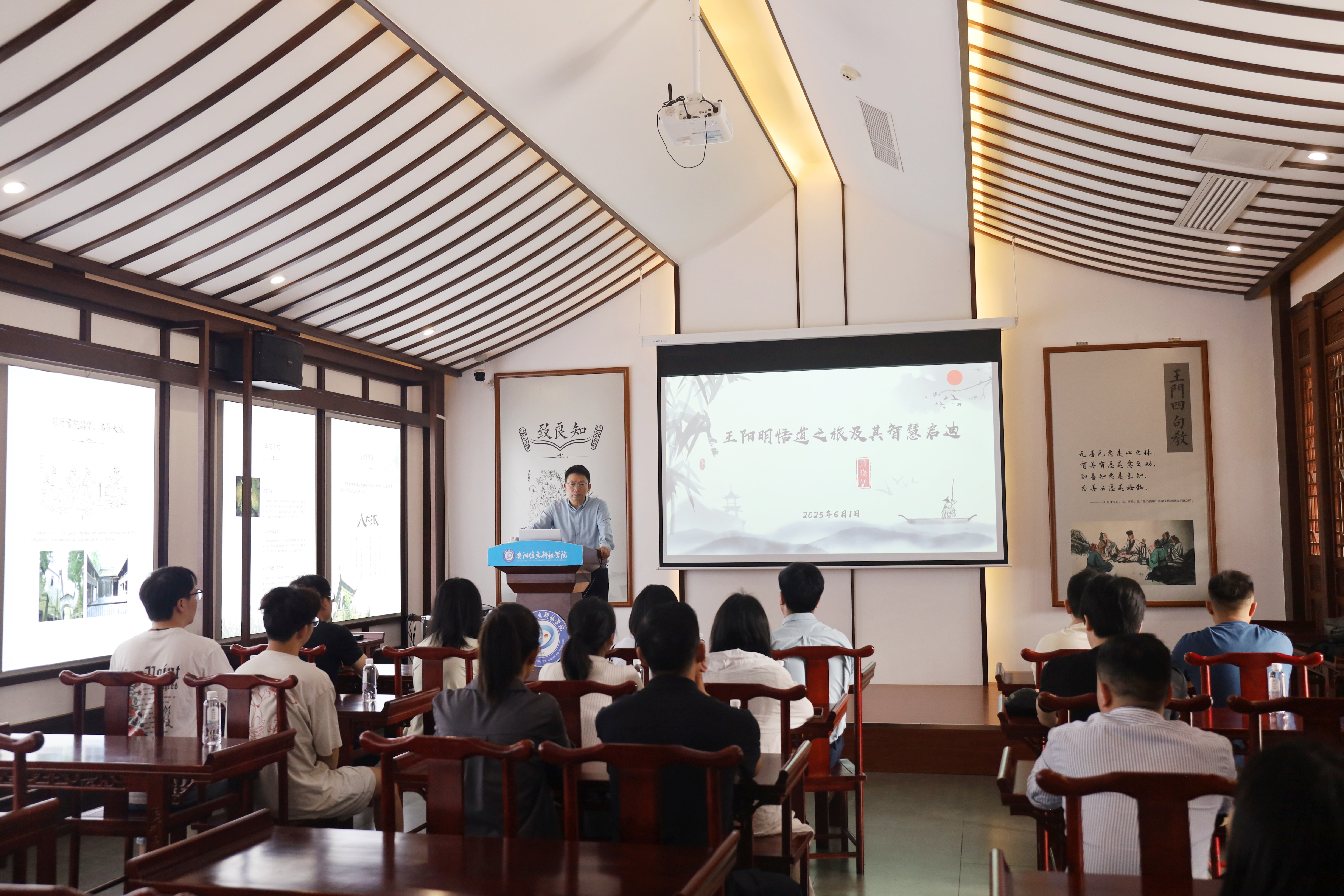 参观结束后,黄晓儒以《王阳明悟道之旅及其智慧启迪》为题,为到访师生带来了一场思想深邃、见解独到的学术讲座。黄晓儒引经据典,深入浅出地剖析了阳明心学中“心即理”“知行合一”“致良知”等核心思想的深刻内涵,并结合当下高等教育立德树人的根本任务,着重阐述了阳明心学对涵养师生道德情操、激发内在学习动力、锤炼笃行不怠品格的宝贵价值。讲座中,黄晓儒特别强调阳明先生“知而不行,只是未知”的实践论,指出在知识传授之外,书院尤为重视引导学生将道德认知转化为自觉行动,在躬行实践中体悟学问真谛。其精辟的论述与深刻的现实关怀,引发了在场师生的强烈共鸣与深度思考。