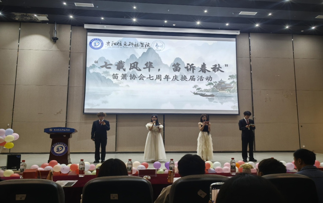 5月25日晚,笛箫协会在图书馆二楼报告厅成功举办了“七载风华,笛诉春秋”七周年庆暨换届大会。学校党委委员、党政办公室主任、宣传部部长、笛箫协会指导老师吴扬,经济管理学院赵政老师、艾艳芳老师;贵州民族大学笛箫协会会长李芳琳;校团委学生会执行主席邹雨航,社团管理部主席吴小路出席,以及各兄弟社团负责人及代表到场祝贺。