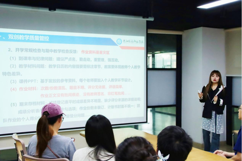 接着,罗晓梅老师通报教学检查情况,指出作业资料、教学材料、课件PPT等方面存在的诸多问题。针对这些问题提出了整改要求,特别强调团队作业需通过“组内互评+个人答辩”体现个人成绩差异,建议采用积分制、随机点名和手机收纳管理提升课堂参与度。