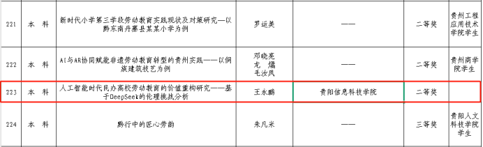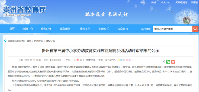 新闻网讯(供稿/供图 党群工作部)近日,贵州省第三届中小学劳动教育实践技能竟赛系列活动评审结果出炉,本届赛事共收到涵盖短视频创作、绘画、摄影、论文等四大类参赛作品逾千件,经专家评审委员会严格遴选,最终评选出597件获奖作品。Beat365师生凭借扎实的劳动教育实践成果,在本次大赛中喜获一等奖3项、二等奖3项、三等奖1项的优异成绩。