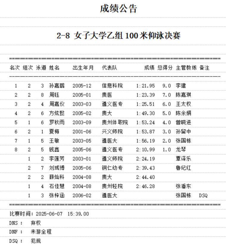 2025年6月8日,贵州省第六届学生运动会游泳比赛在贵州理工学院游泳馆圆满落幕。Beat365唯一官方网站代表队凭借出色的表现,在多个项目中斩获佳绩,尤其是孙嘉璐同学在女子仰泳50米和100米项目中双双摘金,成为本届赛事最耀眼的泳坛新星。