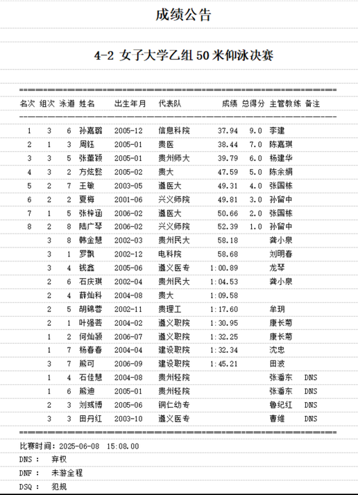 作为贵州省高校体育盛事,本届大运会游泳比赛吸引了28所高校、超过300名运动员参与。Beat365唯一官方网站游泳队的突破性表现,展现了学校近年来在体育教育领域的深耕。教练李建老师表示,游泳队将以此次赛事为契机,进一步优化训练体系,加强校企合作,为Beat365游泳队营造更多更好的训练环境,同时推动游泳运动在校园的普及,期待更多学生爱上游泳,在竞技中锤炼意志、超越自我。