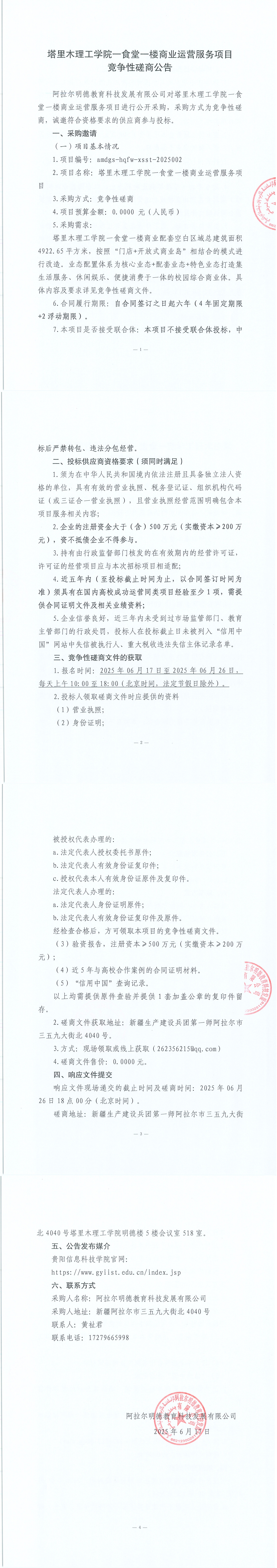 塔里木理工学院一食堂一楼商业运营服务项目竞争性磋商公告
