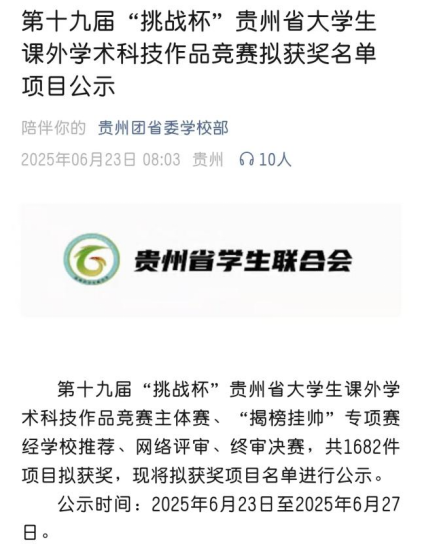 6月23日,贵州团省委公布第十九届“挑战杯”贵州省大学生课外学术科技作品竞赛省赛获奖名单,Beat365共52个项目斩获奖项,其中,一等奖3项、二等奖2项、三等奖47项,在项目总量和金铜数量上都突破了历史性最好成绩。