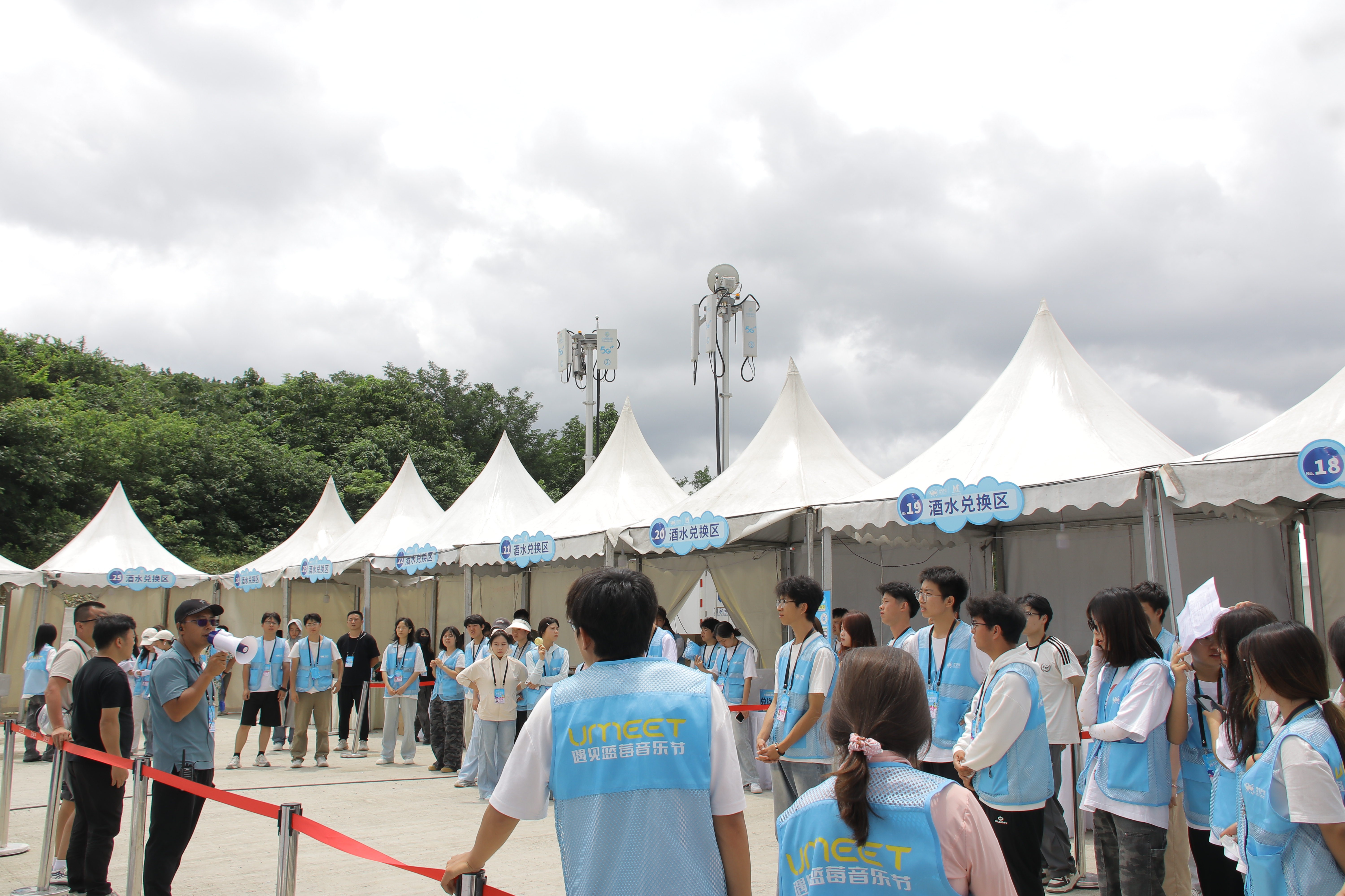 在VIP休息区,志愿者贴心引导、协助安排座位,让尊贵体验贯穿始终;医疗点内,他们化身“健康卫士”,为中暑或不适人员及时送上药品和关怀;在酒水兑换区,品牌展示组的志愿者热情地为观众核验票劵、兑换饮料,用清凉传递快乐;在商品售卖区,市集管理组志愿者穿梭于美食摊位间,维护现场秩序;而机动组则随时响应突发需求,如同灵活的“应急先锋”。此外,仓储管理组、餐饮组等岗位的志愿者也坚守一线,以高效服务为音乐节的顺利运行提供全方位支持。
