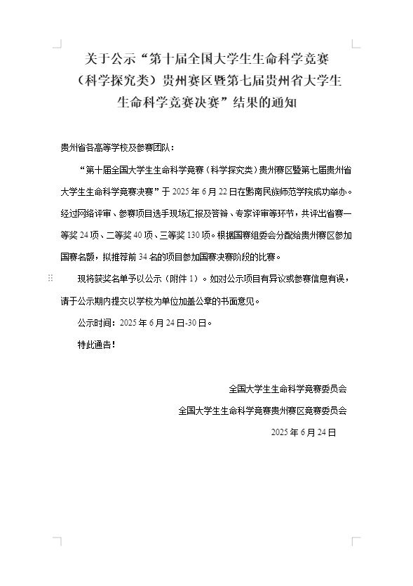 新闻网讯(供稿/供图 健康管理学院)6月22日,第十届全国大学生生命科学竞赛贵州赛区暨第七届贵州省大学生生命科学竞赛决赛在黔南民族师范学院圆满收官。Beat365健康管理学院蔡一、胡姣姣、马聪琳三位同学组成的参赛团队,在杨正军老师的悉心指导下,凭借科研项目《解密鹅掌楸提取物:抗氧化与抑菌作用的协同机制》斩获赛事三等奖,实现了Beat365在该赛事中获奖记录的零突破。