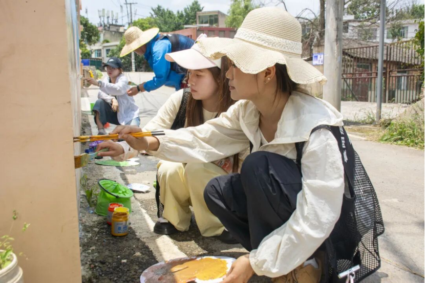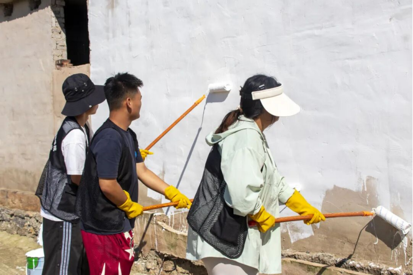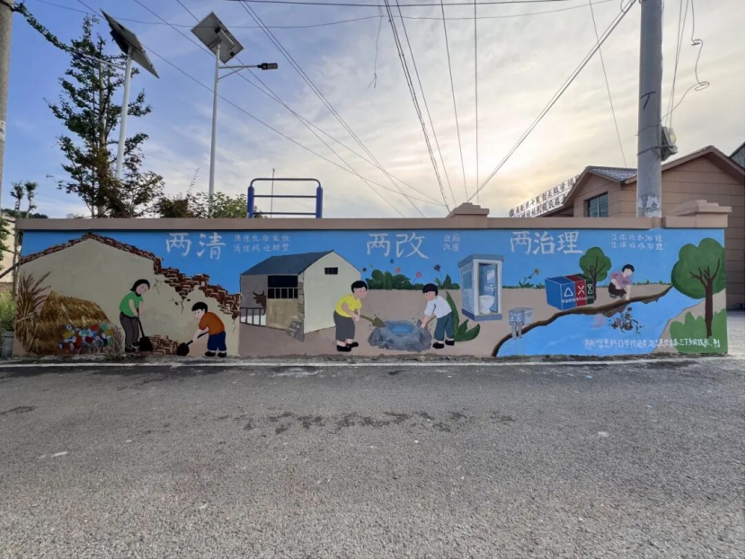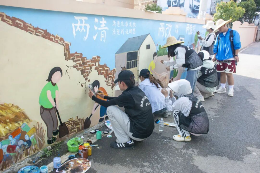 队员们事先对图案内容进行打磨设计,再根据设计好的图案分工协作:有的勾勒清理前的残垣断壁及乱堆乱放现象,有的描绘村民清扫垃圾和治理污水的场景,有的用卡通形象展示改厕改圈景象。烈日当空,同学们却始终守在墙绘旁,画笔不停。这份不惧酷暑的坚持,正是青春最耀眼的光芒。