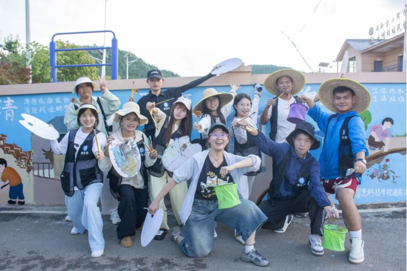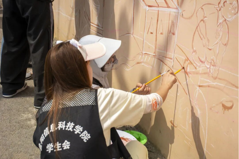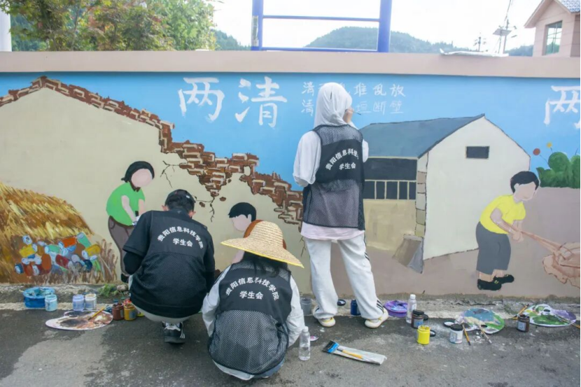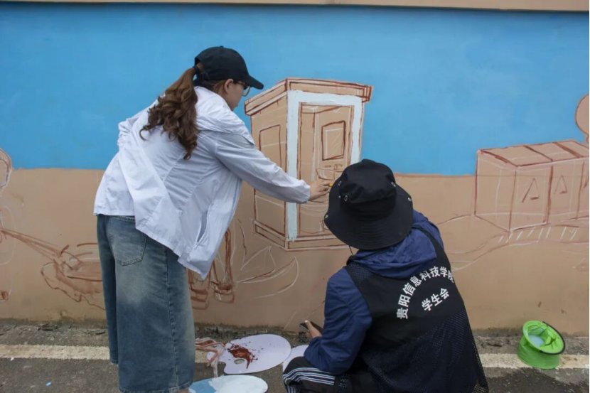 当日,小河村迎来了团委学生会“赴志愿 致青春”三下乡实践队墙绘小队,队员们带着颜料、画笔等工具,围绕“两清两改两治理”主题,在村内墙体上挥笔作画。