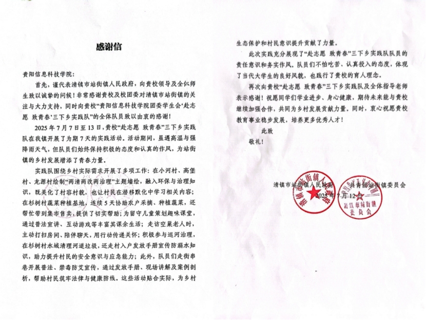 7月12日,站街镇人民政府同样送来感谢信,信中不仅对实践队开展的系列活动表示充分肯定,还赞扬了队员们不怕吃苦、认真务实的良好品德,并表达了日后继续加强合作的愿景。