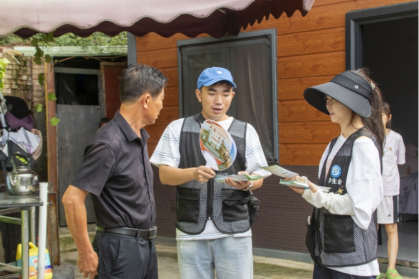 针对杉树村青壮年外出务工、留守群体法律知识薄弱的现状,7月11日,实践队围绕“禁毒”“防艾”及《中华人民共和国未成年人保护法》等内容,走街串巷开展宣传活动。过程中,100余份印有《中华人民共和国未成年人保护法》核心条款的宣传手册、300余份以“禁毒防艾·生命同行”为主题的定制扇子,被一一送到街头巷尾的村民手中,覆盖群众500余人。