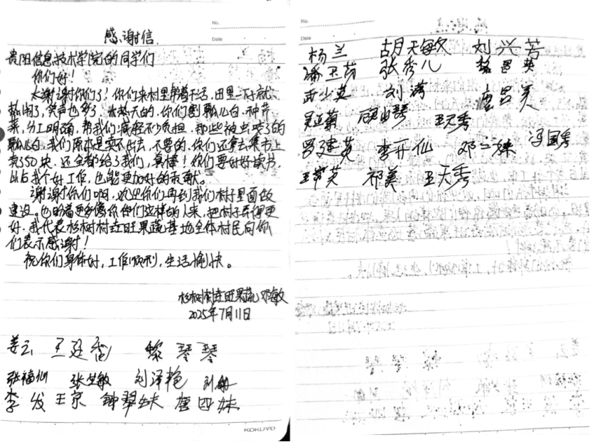 7月11日,杉树村垚旺果蔬村民合作社的农工阿姨们送来感谢信,信上一个个手写的名字,满含着真挚的感激之情,也是对实践队5天助农行动的充分认可。