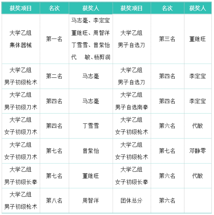 武术队在第六届学生运动会武术比赛中的获奖情况