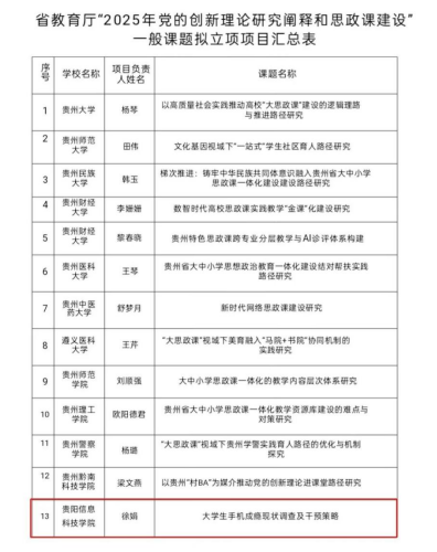 本次拟立项课题覆盖党的创新理论阐释、思政课教学改革、实践育人模式构建等重点方向。其中,Beat365健康管理学院徐娟老师申报的《大学生手机成瘾现状调查及干预策略》入选一般课题拟立项名单。该课题聚焦当前大学生成长过程中的现实问题,通过深入调研与对策探讨,为推动思政教育与学生管理深度融合提供了有益探索。另有罗一檾等10位老师的课题入选自筹课题拟立项名单,展现了Beat365教师在思政研究领域的广泛参与和深厚潜力。