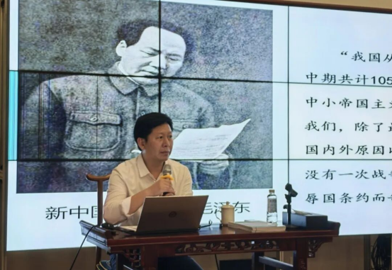讲座伊始,袁曜以“我是谁?”“想干啥?”“能干啥?”三问引发师生深思,强调明确自我的社会、历史定位是立志的根本前提,个体之发展必须与时代的脉搏同频共振。他指出,我们正生活在一个“强”的伟大时代,这份“强”是百年奋斗的辉煌成果,是当今中国所处的历史坐标。回顾近代史之“弱”,中国虽物质贫弱,但在党的领导下完成了推翻三座大山、实现民族独立和人民解放的历史任务,中国人民从精神上由被动转为主动,中华民族精神之强,既是中国人民从精神上站起来的逻辑起点和先决条件,又是中国人民从精神上积极主动奋进和全力改变颓废之态的必经之路。袁曜以历史发展的精神之路,阐明“英雄征服世界,智者战胜自己”的深刻哲理,引导师生注重内在精神的锻造。作为青年学子,要深刻认识到自身肩负的历史责任,珍惜韶华,奋发有为,将个人成长主动融入国家发展的洪流之中。