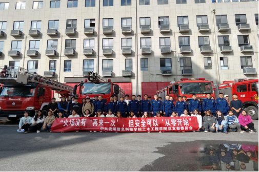 图为土木工程学院参与活动师生同花溪区消防大队消防员合影