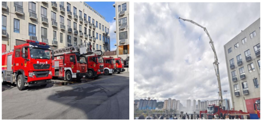 图为花溪区消防大队救援车辆模拟作业现场