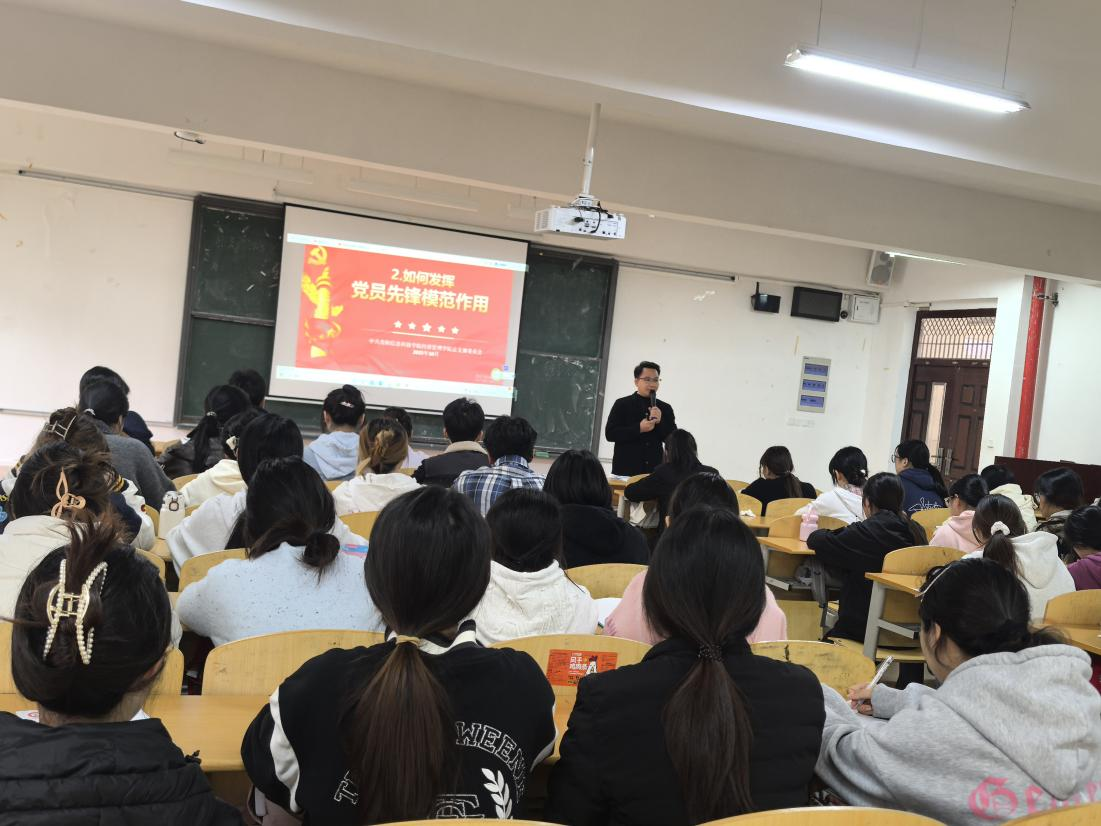 新闻网讯(供稿/供图 经济管理学院学生党支部)为深入学习贯彻党的二十届四中全会精神,进一步加强学生党员队伍建设,明确新时代青年党员的使命担当。2025年10月29日,经济管理学院在B栋209成功举办了一场主题为“以思想之光燃经管之火, 以党建之力育时代新人”的专题党课。本次党课由学院党总支书记莫建活主讲,学院学生党员80余人参加了学习。