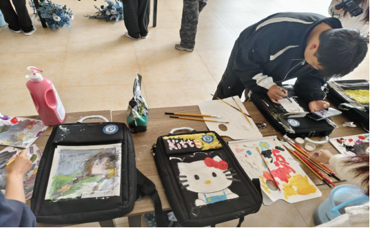 活动现场精心筹备了品类齐全的丙烯颜料与多型号专业画笔,以完备的物资保障为同学们的艺术创作筑牢基础,让创意表达无后顾之忧。创作环节中,同学们围绕色彩搭配巧思与画面构图技巧展开深入交流,灵感在思想碰撞间迸发,温馨融洽的氛围与热烈高涨的创作热情交织,生动展现出大家对艺术的热爱与团队协作的活力。