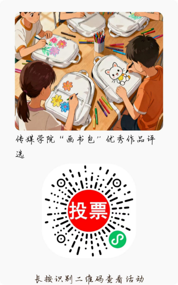 各位同学:“画书包”创意设计比赛已进入投票阶段!感谢大家的积极参与与精彩创作,现在邀请全体同学为你喜欢的作品投上宝贵的一票~