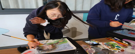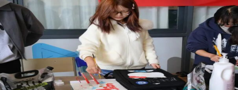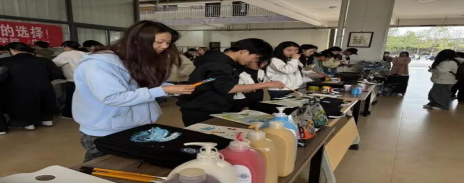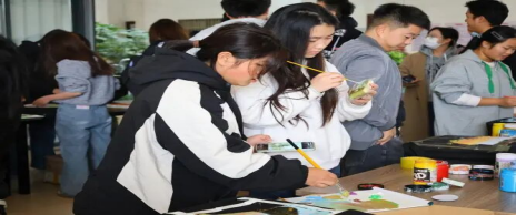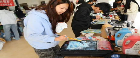 活动现场,工作人员精心筹备了品类齐全的丙烯颜料与多型号专业画笔,以完备的物资保障为同学们的艺术创作筑牢基础,让创意表达无后顾之忧。创作环节中,同学们围绕色彩搭配巧思与画面构图技巧展开深入交流,灵感在思想碰撞间迸发,温馨融洽的氛围与热烈高涨的创作热情交织,生动展现出大家对艺术的热爱与团队协作的活力。