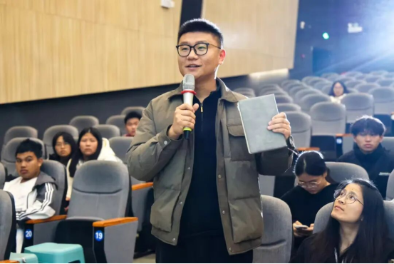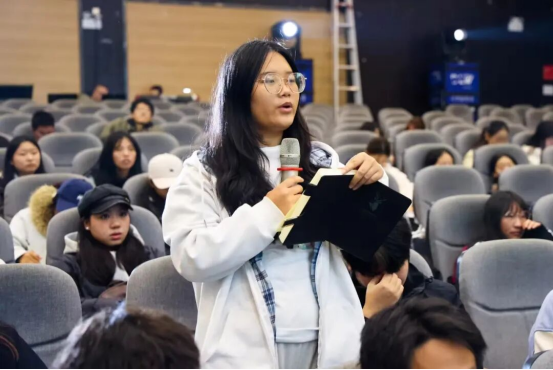 师生代表与主创团队的互动交流成为现场亮点。数字传媒学院视觉2402班龙利丹提问:“面对不了解王阳明的年轻观众,团队如何让话剧保持吸引力?”雷欣回应,创作中始终避免生硬的哲学说教,而是聚焦人物面对困境的抉择,“年轻人能从他身上看到坚守本心的力量,这就是最朴素的共鸣点”。土木工程学院工管2501班禹富豪好奇主演的角色塑造秘诀,张鹏霄坦言,为贴近人物,他不仅闭门研读史料,更在每一场演出中结合观众反馈调整状态,“第五十场的王阳明,比第一场多了更多温度,这也是‘知行合一’在表演中的实践”。