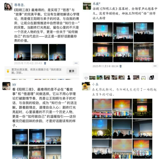 据悉,自2017年创排至今,《阳明三夜》已历经八载打磨,足迹遍布合肥、赣州、贵阳、南昌等地。11月4日至5日,该剧在学校连演三场,其中5日下午的场次正是其巡演第五十场,特殊的意义让现场观演氛围格外浓厚。演出过程中,同学们自发在朋友圈记录观剧心得,“在第五十场的舞台上遇见王阳明,这份共鸣格外珍贵”“‘此心光明’四个字,值得记一辈子”等感悟刷屏社交平台,对话剧艺术表现力的认可与对心学思想的热议交织升温。