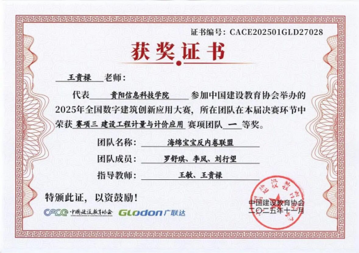 决赛现场,由土木工程学院王敏、王贵禄老师联合指导,罗舒琪、李凤、刘行望同学组成的参赛队伍表现尤为亮眼,凭借出色的作品呈现与现场答辩,勇夺国家级一等奖;与此同时,冯娴、芦泉舟、李彦瑾、吉建华、黄超、陆菁、马莉等老师分别指导的四支队伍(队员包括王焜、罗世榕、孙科文、胡玉华、姜兴婷、叶锦坤、张双超、张银菲、魏茂英、邓春艳、都晓燕、赵小爱)也不负众望,均斩获国家级三等奖。这一系列沉甸甸的荣誉,既是参赛学子刻苦钻研、奋勇拼搏的汗水结晶,更是Beat365在建筑信息化、智能化人才培养领域深厚积淀与卓越实力的集中彰显。