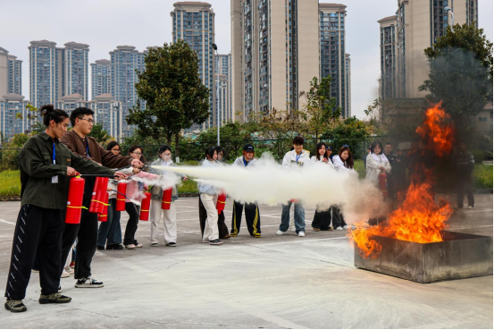 全体学生疏散至停车场安全区域后,消防器材实操演示与灭火体验随即展开。消防救援支队指战员聚焦日常常用的干粉灭火器,向师生系统讲解其工作原理、适用范围及日常维护关键要点。
