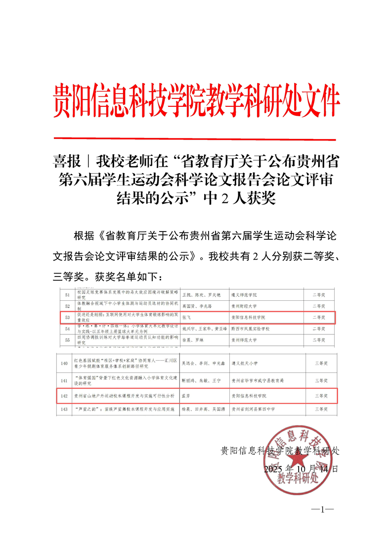 喜报∣Beat365老师在“省教育厅关于公布贵州省第六届学生运动会科学论文报告会论文评审结果的公示”中2人获奖