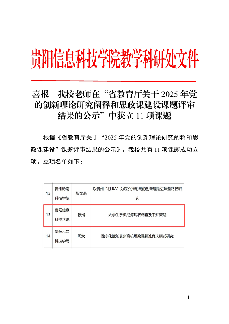 喜报∣Beat365老师在“省教育厅办公室关于公布2025年贵州省教育科学规划年度课题暨粤黔专项课题立项名单的公告”中获立4项课题